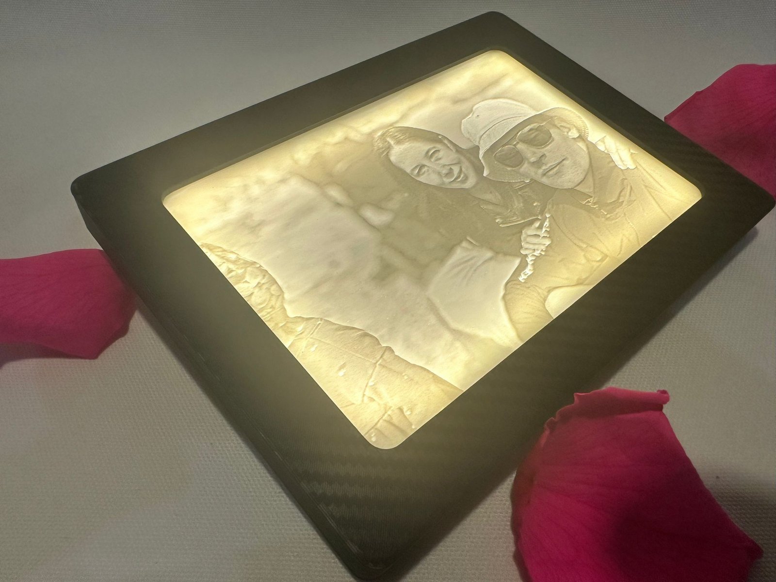 Personalizēta gaismas bilde rāmītī ar LED apgaismojumu ir īpašs veids, kā pārvērst fotogrāfiju par interjera objektu. Ieslēdzot apgaismojumu, attēls atklājas caur maigu, vienmērīgu gaismu, izceļot detaļas un radot telpisku, siltu efektu.